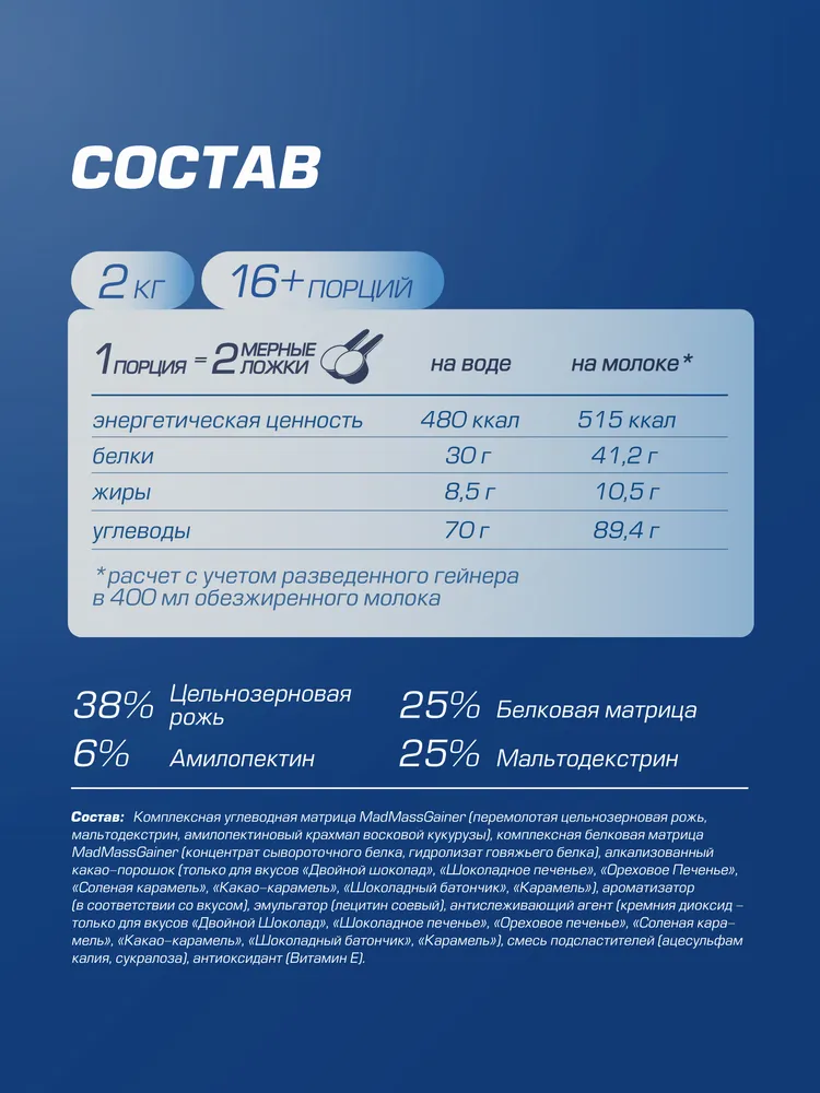 MadMassGainer — гейнер на основе комплексной углеводной матрицы (перемолотая цельнозерновая рожь, мальтодекстрин, амилопектиновый крахмал восковой кукурузы). С большим содержанием белка (концентрат сывороточного белка и гидролизат говяжьего белка) и комплексом ферментов, который улучшает усвояемость углеводов.