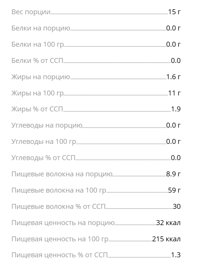водорастворимые волокна кукурузы, инулин (пищевые волокна), олигофруктоза (пищевые волокна), вода, масло кокосовое, агент влагоудерживающий (глицерин), ароматизаторы натуральные, антиокислитель (аскорбиновая кислота), соль морская, консервант (сорбат калия).