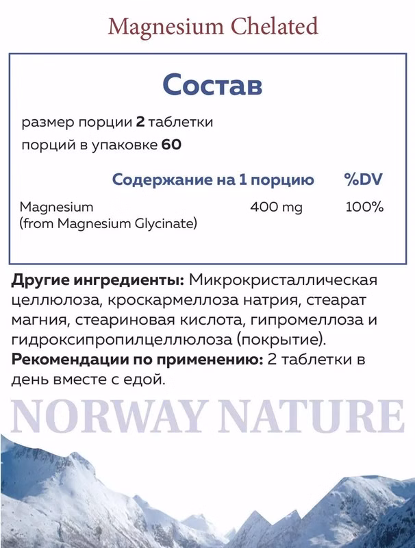Norway Nature Magnesium Chelated 400 mg — хелатная форма магния в легкоусвояемой форме Глицинат, считается одной из лучших форм магния на сегодняшний день.