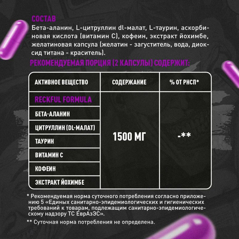 2SN RECKFUL pre-work не содержит в своем составе креатин, поэтому может быть использован при жиросжигающих диетах и сушке, так как не будет провоцировать задержку жидкости в организме.