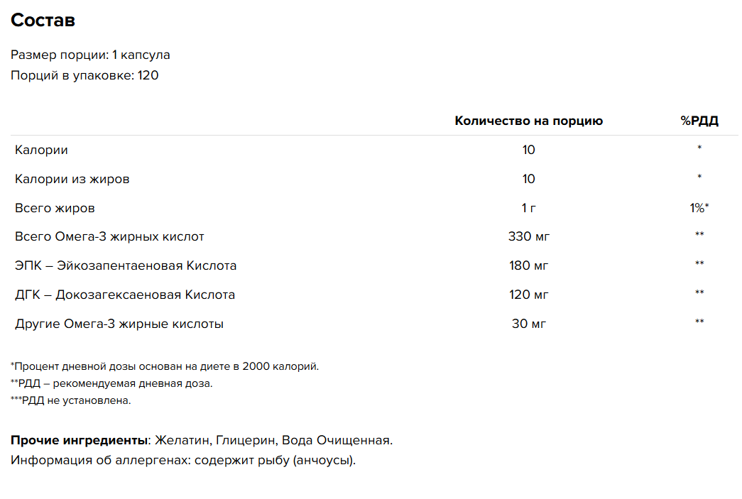 Омега-3 — это жирные кислоты, неотъемлемо важные для поддержания и сохранения здоровья, молодости и работоспособности. Они оказывают комплексную поддержку всему организму, в особенности сердечно-сосудистой и иммунной системам, а также органам, которые отвечают за быструю передачу информации, — глазам и мозгу. Омега-3 не синтезируются организмом, поэтому их необходимо ежедневно добавлять в свой рацион. Жирные кислоты содержатся во многих продуктах, но особенно ими богаты свежая морская рыба и морепродукты. Однако зачастую организм не получает нужного количества Омеги-3 из пищи, поэтому их прием в качестве добавки считается наиболее эффективным.