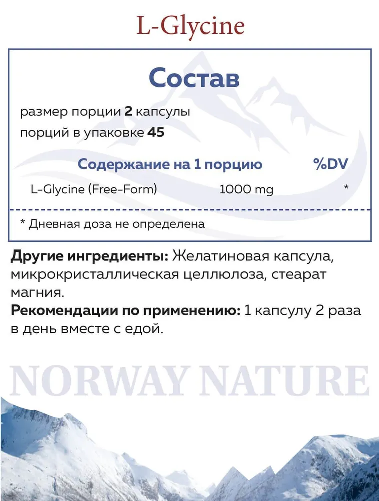 Norway Nature L-Glycine — является полезной и важной добавкой — он обладает успокаивающим и ноотропным действием, необходимым для синтеза структурных белков (коллагена) и ферментов. Улучшает сон и настроение, уменьшает психоэмоциональное напряжение, агрессивность и конфликтность, повышает умственную работоспособность.