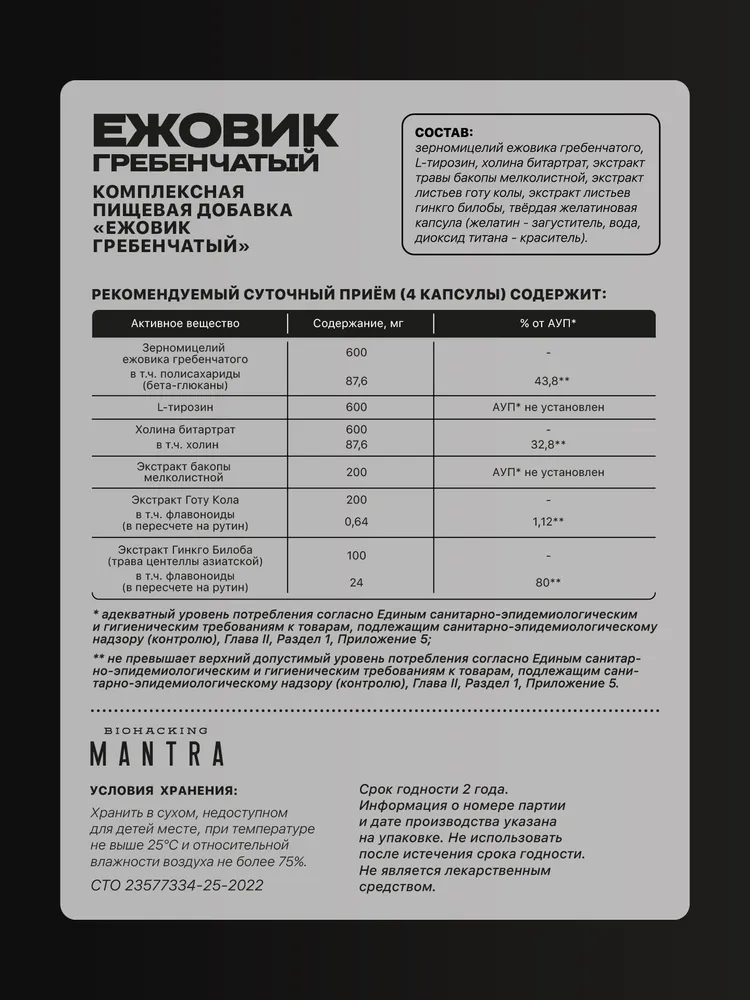 Чувствуете рассеянность, забывчивость и снижение концентрации? Biohacking Mantra представляет мощную формулу на основе Ежовика Гребенчатого, усиленную L-тирозином, холином и растительными ноотропами — ваш ключ к кристальной ясности ума и высокой продуктивности! Что такое Ежовик Гребенчатый и почему он так важен для мозга? Ежовик Гребенчатый (Hericium erinaceus) — это уникальный гриб, который веками используется в традиционной медицине. Он содержит соединения, стимулирующие рост и регенерацию нервных клеток, улучшая когнитивные функции и память. Biohacking Mantra «Ежовик Гребенчатый» — это: Улучшение памяти и концентрации: Ежовик Гребенчатый стимулирует нейрогенез, способствуя формированию новых нейронных связей и улучшая когнитивные функции. Повышение продуктивности и креативности: Оптимизированная формула помогает улучшить концентрацию, ясность мышления и повысить креативность, позволяя вам достигать большего. Поддержка нервной системы: Успокаивает нервную систему, снижает уровень стресса и тревожности, улучшая общее самочувствие. Улучшение настроения: Способствует выработке нейротрофического фактора мозга (BDNF), который играет важную роль в регулировании настроения. Синергетический состав: Усиленная формула с L-тирозином, холином, бакопой и готу колой обеспечивает максимальную эффективность. Ключевые компоненты и их действие:
