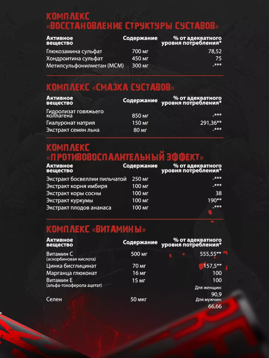 - МСМ (метилсульфонилметан) — снимает воспаление и ускоряет регенерацию связок