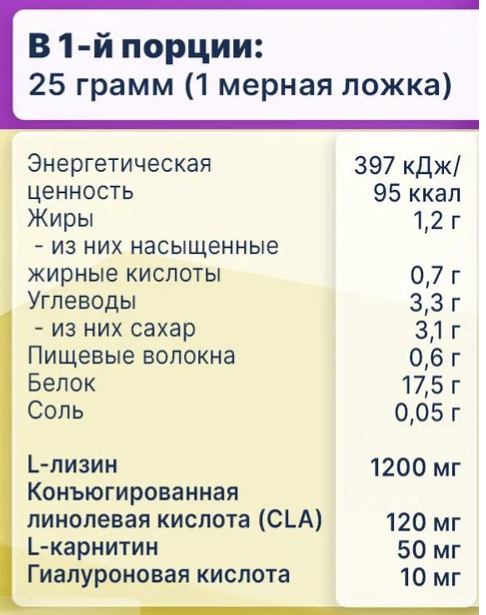 - Ингредиенты премиум-класса: включает концентрат сывороточного белка, L-лизин, CLA, L-карнитин и гиалуроновую кислоту.