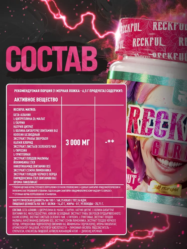 Состав (на порцию 6,5 гр): Reckful GIRL Matrix — 3000 мг (Бета-аланин, L-цитруллина dl-малат, L-таурин, Натрия цитрат, L-холина битартрат (витамин B4), Кофеин безводный, Экстракт травы зверобоя, Калия хлорид, Экстракт листьев зеленого чая, L-тирозин, L-триптофан, Экстракт плодов малины, Йохимбина г/хл, Никотинамид (витамин B3), Экстракт семян лимонника, Экстракт плодов черного перца, Пиридоксина г/хл (витамин B6), Хрома пиколинат)