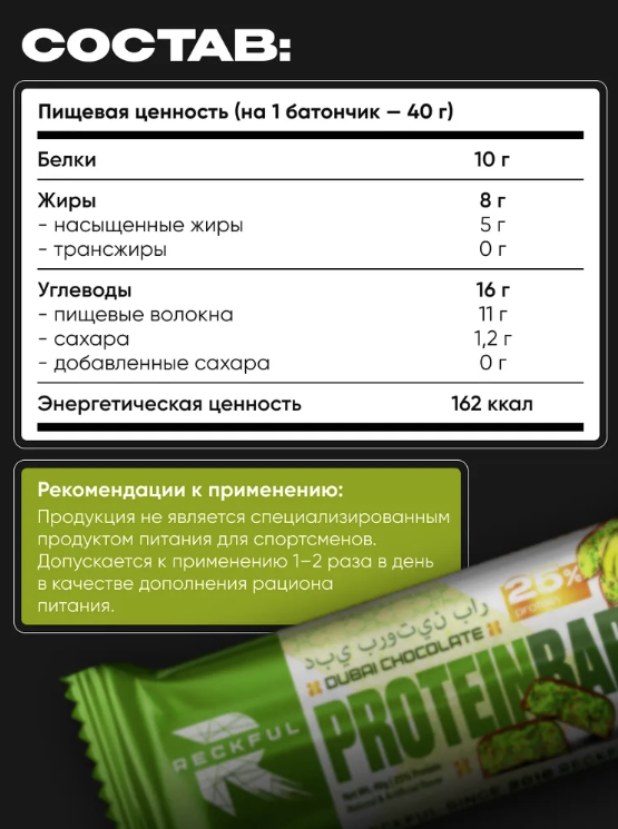 Высокобелковые протеиновые батончики Reckful ProteinBar со дубайского шоколада — это отличное решение для тех, кто ведет активный образ жизни и следит за своим питанием.