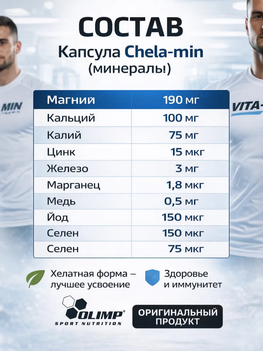 - Chela-Min Sport. Состоит из 10 минералов в хелатной форме, которые отличаются высокой устойчивостью к канцерогенам и хорошим усвоением. Благодаря повышенному содержанию цинка, магния и йода комплекс обеспечивает хорошую поддержку для эндокринной системы. Также этот комплекс защищает от атеросклероза, уменьшает риск возникновения воспалительных заболеваний.