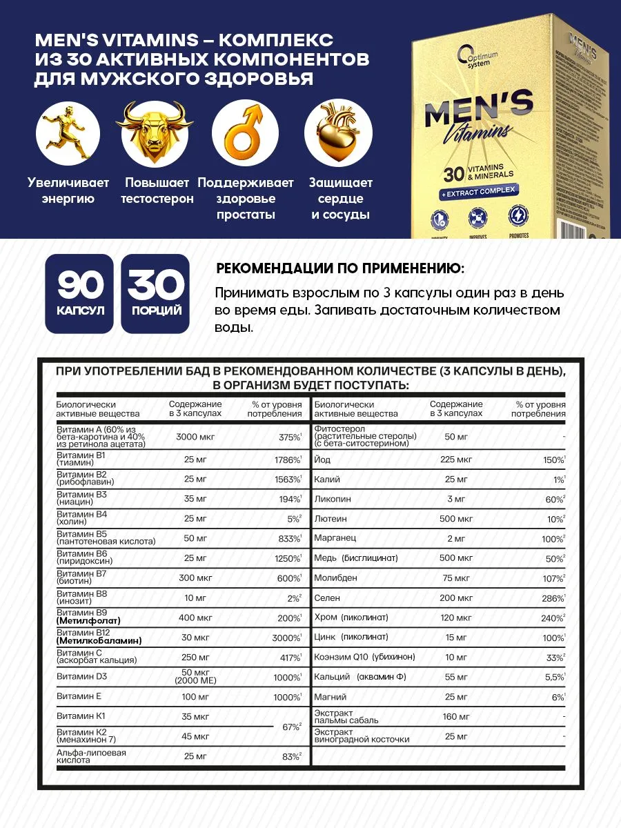 «Men's Vitamins» — это сбалансированный комплекс для поддержания мужского здоровья, энергии и жизненного тонуса. Добавка содержит 30 активных компонентов, включая витамины группы B, D3, цинк, селен, йод, растительные экстракты и фитостеролы.