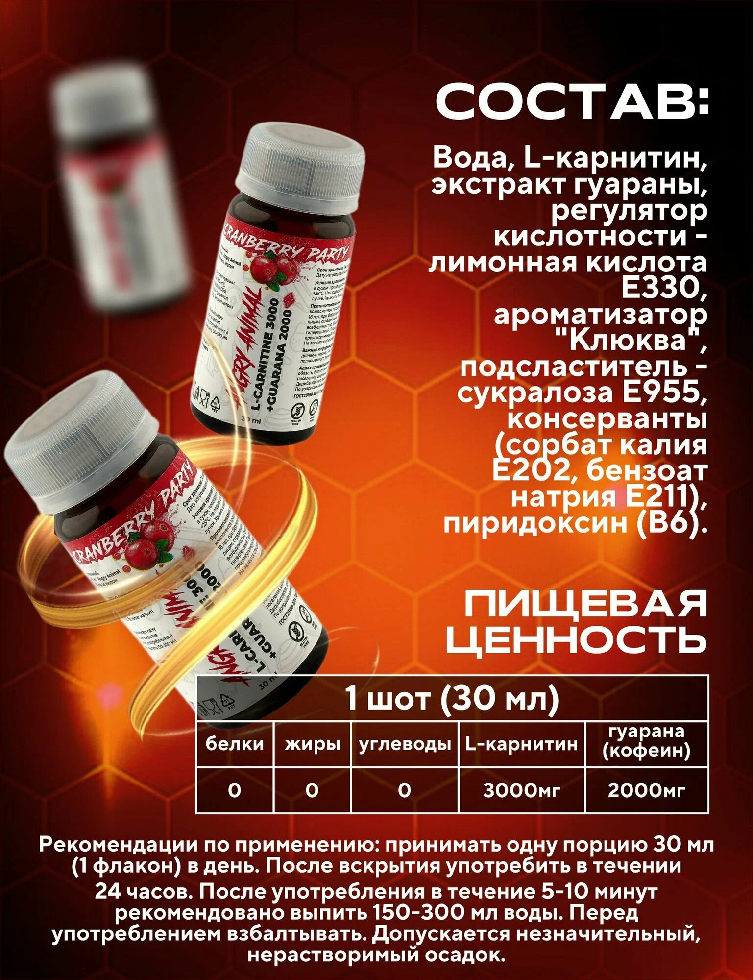 Раскройте потенциал своего тела и ума с Angry Animal L-Car 3000 + Guarana 2000 — мощной жидкой БАД, созданной для тех, кто не знает компромиссов. Эта формула объединяет 3000 мг L-карнитина и 2000 мг экстракта гуараны в одной порции (30 мл), обеспечивая двойной эффект: усиление энергетического обмена и повышение фокуса. L-карнитин помогает организму эффективнее использовать жиры как источник энергии, что особенно ценно перед тренировками или интенсивной умственной работой. Экстракт гуараны, богатый натуральным кофеином (200 мг на порцию), дарит бодрость, концентрацию и выносливость без резких скачков и последующего «провала».