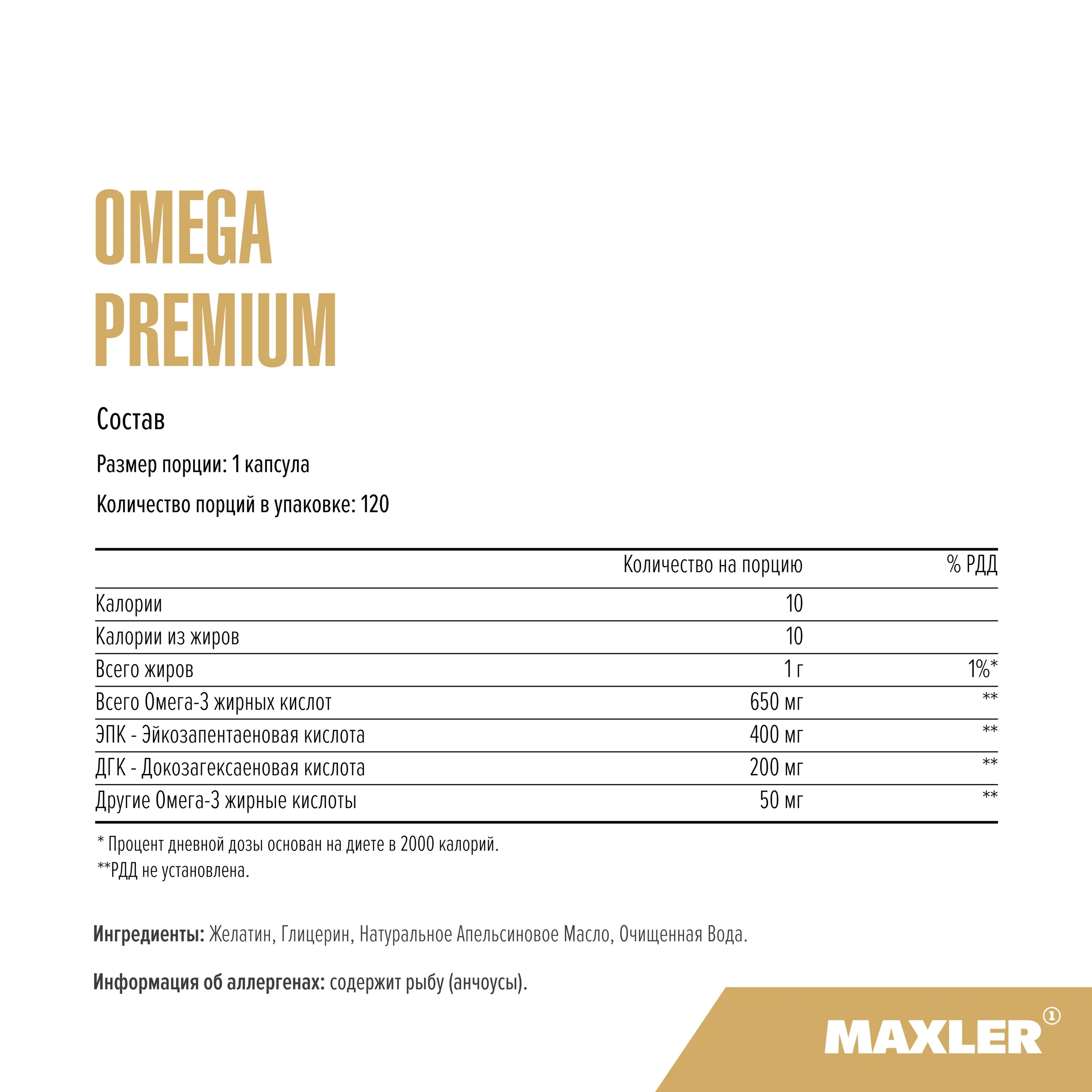Потребление достаточного количества омега-3 несет огромную пользу организму. Попробуйте включить в свой рацион больше морепродуктов, рыбы или орехов. Но если вы хотите дополнить свой рацион или легче достигать поставленных целей, воспользуйтесь одной из специальных добавок. В Maxler Omega-3 Premium отличный цитрусовый вкус сочетается с оптимальной дозой высококачественных омега-3.