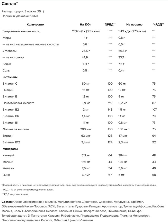 Смешайте 3 мерные ложки (75 г) порошка Mega Gainer с 500 мл молока или воды. Употребляйте 2-3 порции в день. Подходит для приема как до, так и после тренировки. Принимайте между приемами пищи в дни, когда вы не тренируетесь, или если ваша цель — просто увеличить количество калорий.