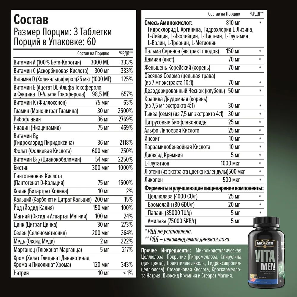 Комплекс VitaMen от Maxler содержит смесь витаминов и минералов, а также фитонутриентов, подобранных с учетом потребностей мужского организма. Он способствует поддержанию умственных и физических способностей на высоком уровне, вносит вклад в здоровье простаты, уменьшает проявления стрессовых ситуаций и нормализует пищеварение. Помимо этого, в составе комплекса есть быстро усваиваемые аминокислоты, которые необходимы для восстановления и роста мышечной массы. С данным комплексом любой мужчина получит полный набор компонентов, необходимых ему для нормального функционирования организма каждый день.