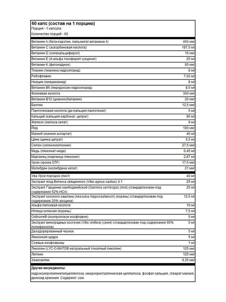 Оптимальный состав без передозировок и занижения отдельных компонентов. Железо, фолиевая кислота, витамин D + комплекс для снижения лишнего веса помещается в двух капсулах для ежедневного применения. Фитнес-нагрузки в тренажерном зале, танцы, йога преображают женское тело, делая его моложе и привлекательнее для мужчин, а витамины OPTI-WOMEN поддерживают процессы жиросжигания и внешнюю женскую красоту. OPTI-WOMEN — идеальное решение для активных женщин, чтобы всегда быть в самой лучше форме!